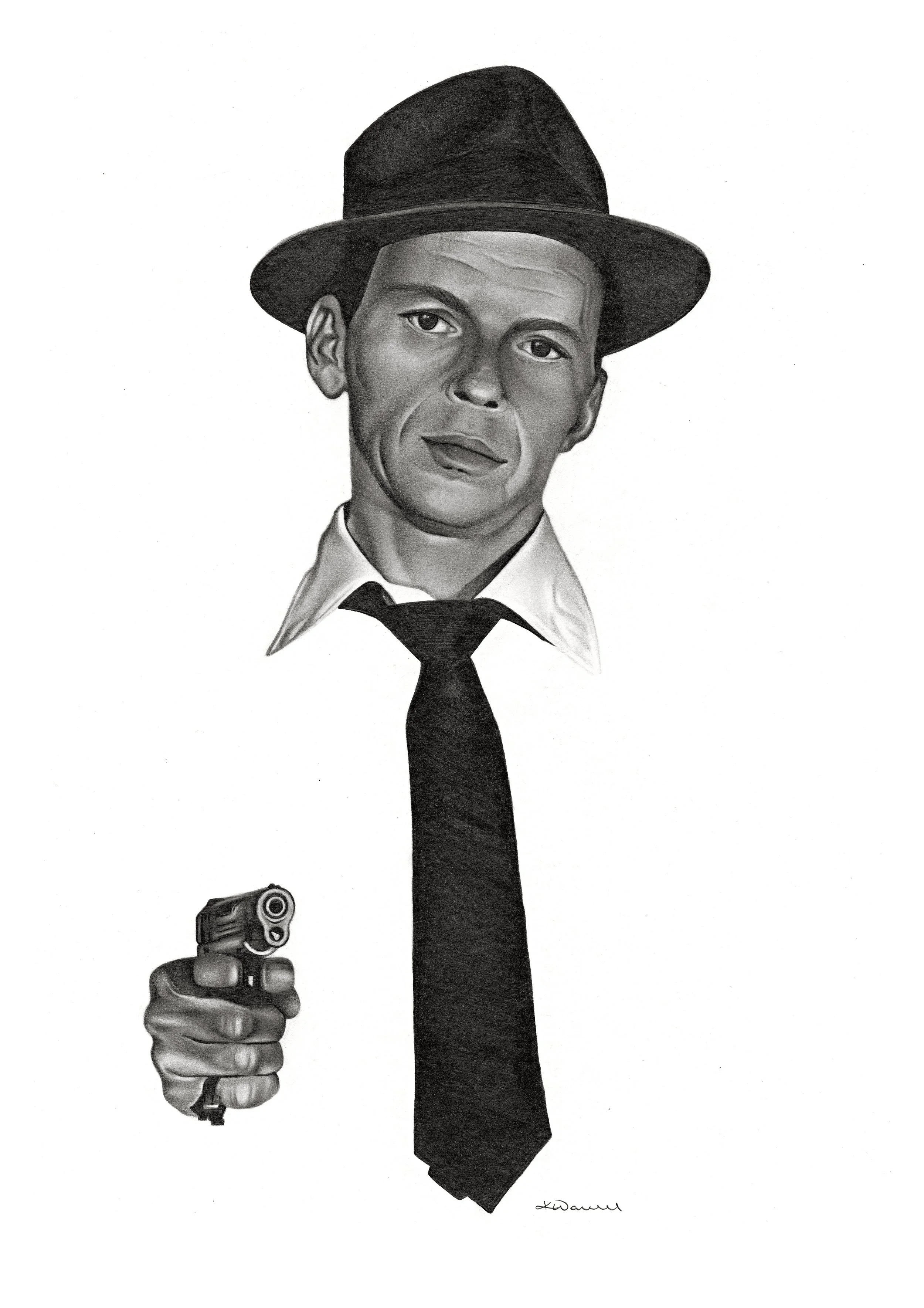 Frank Sinatra is reimagined through a noir-tinted lens. With a fedora tilted just so, and a gaze caught somewhere between sorrow and swagger, Sinatra’s crooner persona collides with the cold demeanour of a classic gangster. The minimalist composition heightens the drama - a stark tie, a disembodied hand gripping a revolver, and a void of background. Here, Sinatra blurs the line between serenade and threat, performance and persona - a ballad with a trigger, sung in grayscale.
