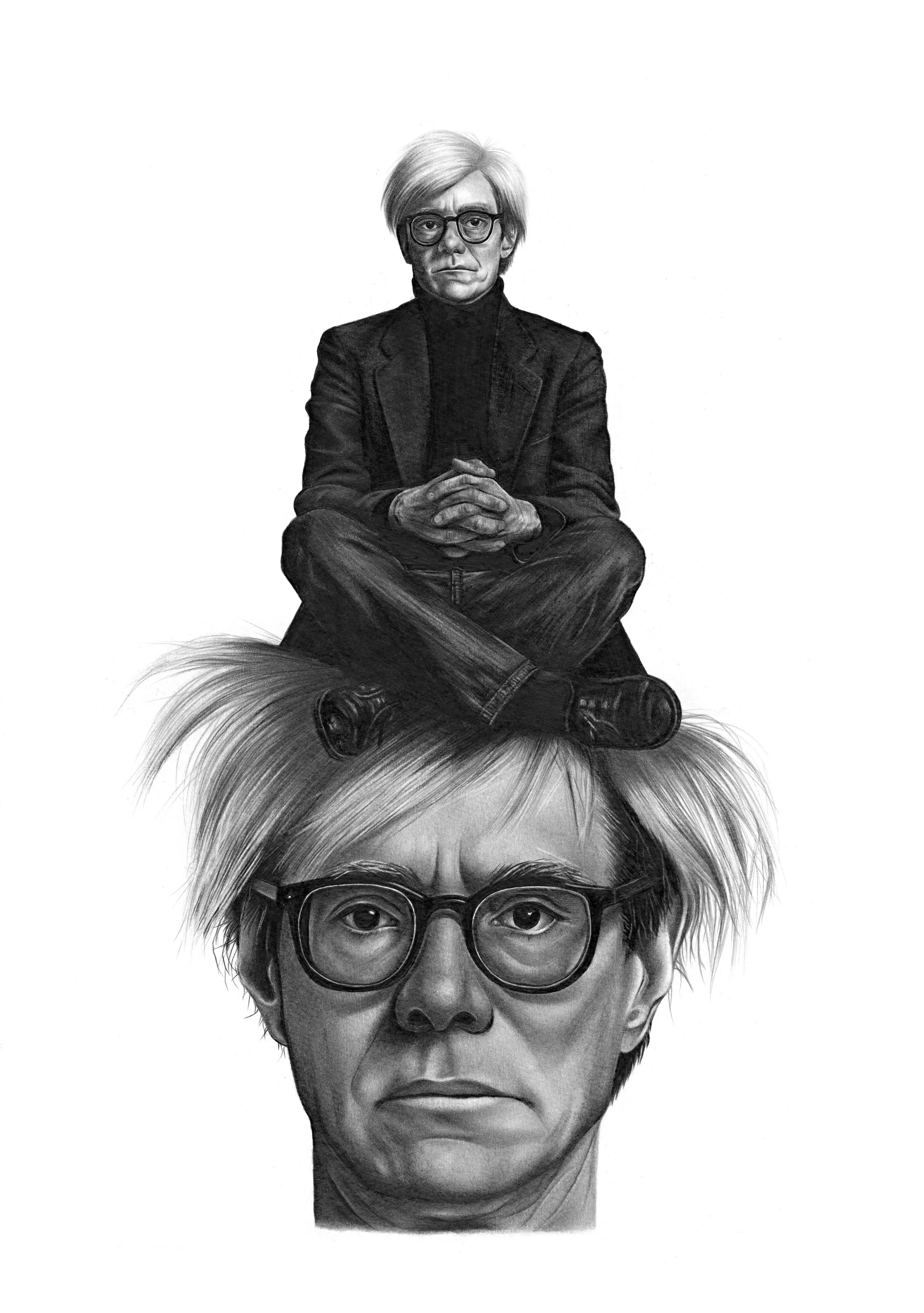 A haunting meditation on identity and legacy, this drawing of Andy Warhol captures the weight of self-awareness and the burden of persona. The seated figure atop his own head feels like a soul watching itself - an artist endlessly observing, curating, and questioning his place in the world. It evokes the loneliness behind fame, the quiet tension between surface and depth, and the surreal poetry of a man who turned himself into both subject and symbol.