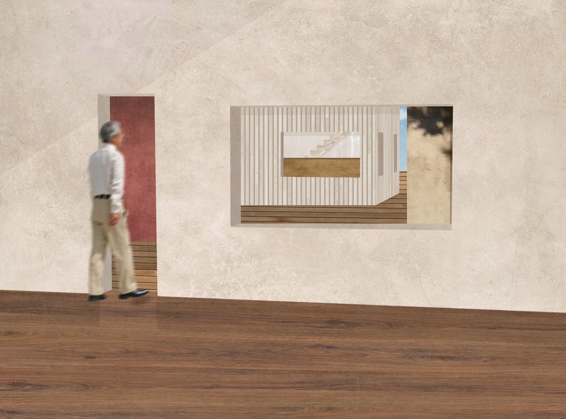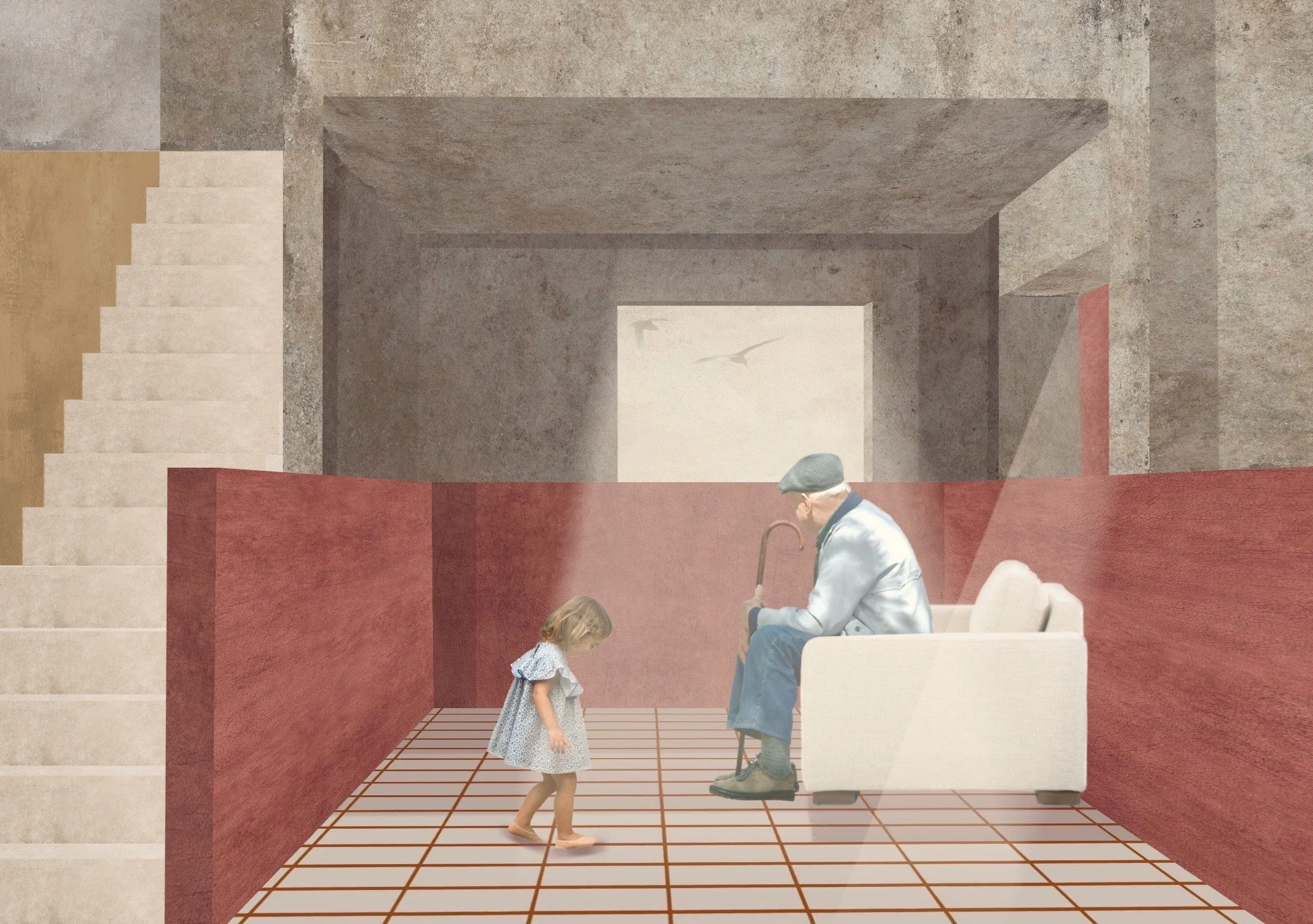 The Home From Home project aims to provide a series of spaces including residential homes, a supermarket, launderette, art studio and other services which which aim to slow down the resident's cognitive decline, or at least, improve their quality of life. Longterm accommodation will be available to those suffering from cognitive impairment, in addition to on-call rooms for carers on shift, as well as short-term stays for families of residents, who wish to spend time with their loved-ones without the added stress of taking on the role as a carer. The temporary family accommodation takes on a form which mirrors that of Charles Moore's Sea Ranch Condominium, the materiality, however, will embrace textural and colourful contrast to zone spaces and provide them with an identity.