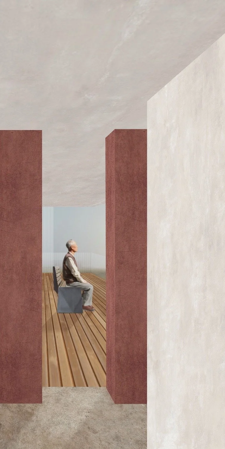 The formerly derelict site, that is the East India dock basin, will transform into a piece of permanent infrastructure which will nurture the elderly and pay homage to the basin's history, via the extraction of earth from the site. which will be used in the walls, in addition to the repurposing of the warehouse into a greenhouse, which will be inhabited with stimulating plants to challenge the minds of the residents.